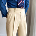 The Ascot High-Waist Trousers embody pure tradition. Inspired by British tailoring, they feature a structured high waistband that enhances the midsection while creating a naturally commanding posture. The intentional front pleats bring volume and elegance, ensuring a firm, refined fit that flatters the male silhouette.