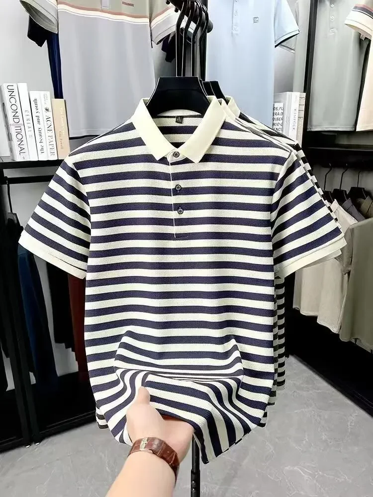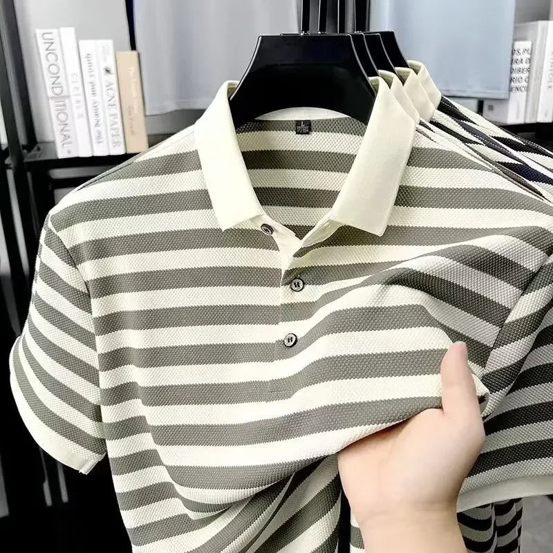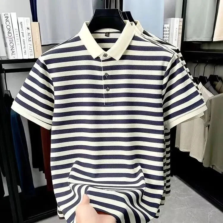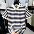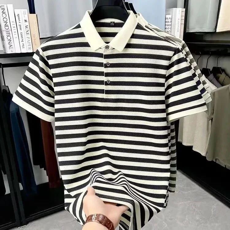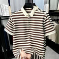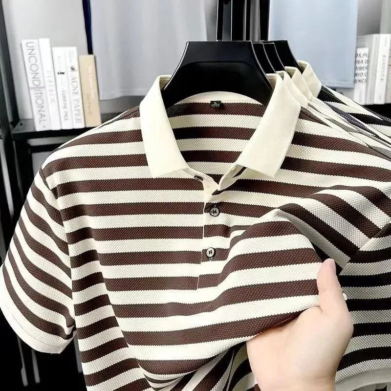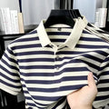 Inspired by the understated charm of European summers, the Ashford Riviera Polo blends tradition and refinement in a piece designed for men who appreciate quiet luxury. Its horizontal stripes in deep brown and ivory create a classic aesthetic, reminiscent of the wardrobe found in coastal clubs and private resorts frequented by aristocratic families.